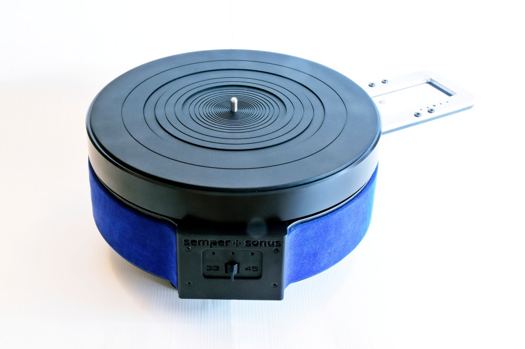 Starting with the drive system, motion is supplied by a BLDC motor, epicyclically driving the aluminum platter through an urethane drive wheel. The motor is attached to a telescopic cradle using sorbothane rings for vibration decoupling.