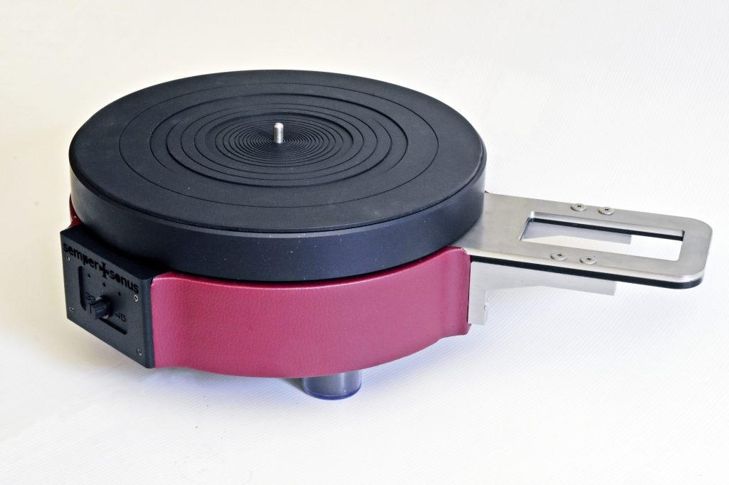 Except for the tonearm support and the speed controls area, the whole plinth is finished in highly durable Alcantara (TM). Two colours are available, black and dark brown.